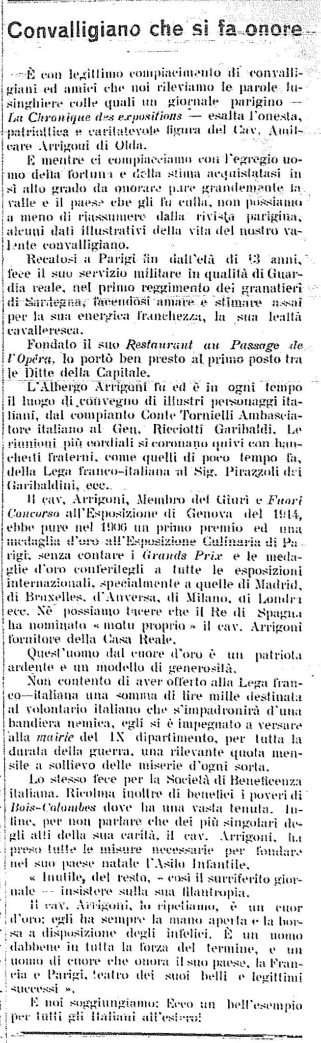 Articolo de La Chronique des Expositions Datazione: marzo 1915Luogo: Parigi, FranciaDescrizione: Il giornale parigino esalta l’onesta patriottica e caritatevole figura del cav. Amilcare Arrigoni di Olda di Taleggio.La Voce del Brembo, n. 13 marzo 1915 Articolo precedente: Franchini Emanuele Prec Articolo successivo: Genini Renato Avanti