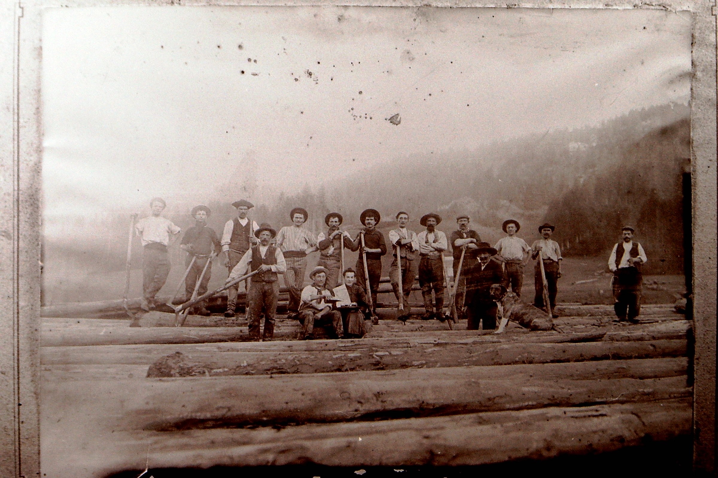 Descrizione: Gruppo di boscaioli di Brembilla 4° Gervasoni Giuseppe “Gìge”5° Locatelli Giuseppe “Cabarèl” nato il 05.04. 1874 - 7° Gotti Ambrogio ”Cèl” nato il 10.11.1862 – 9° Carminati Stefano “Stéen” - 12° Salvi Battista “Pulina” 18.01.1887 - 13°Gamba Antonio” Tonèla”11.08.1862 - 15° Salvi Alessandro “Ciando”08.10.1862 .