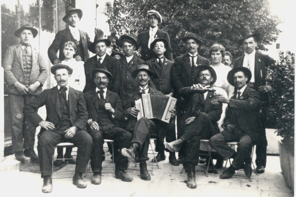 Descrizione: Festa tra emigranti Brembillesi: seduti prima fila da sx i fratelli: 1°Carlo 2°Paolo 3° Pietro” Pèro” alla fisarmonica e 4°Battista Musitelli della contrada Pelato - 5° Genini Battista – Piazzoli.