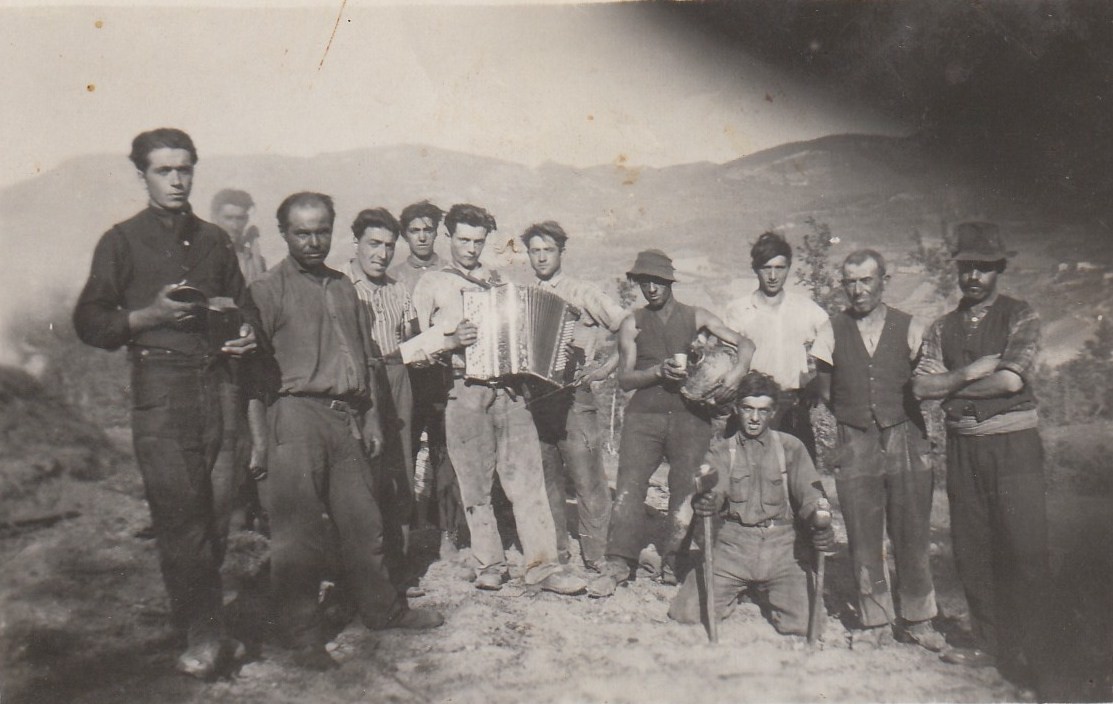 Descrizione: squadra di carbonai di Sant’Antonio Abbandonato Brembilla. Nell’immagine, il primo da è Gervasoni Battista, il terzo è Pesenti Lugi “Luigiòt”, il quarto è Pesenti Martino “Mòia”, il quinto è Pesenti Pietro e il sesto è Sonzogni Giuseppe “Bèpe”.