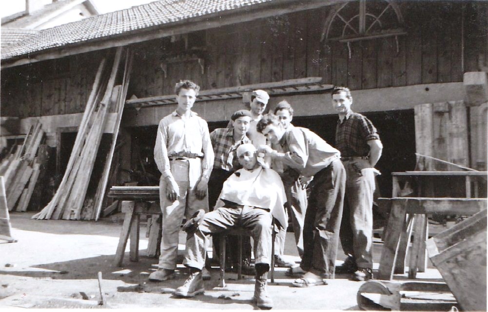 Descrizione: squadra di carpentieri emigranti di Brembilla in relax domenicale per il taglio dei capelli. Da sinistra il primo è Carminati Onorino “Misarol”.