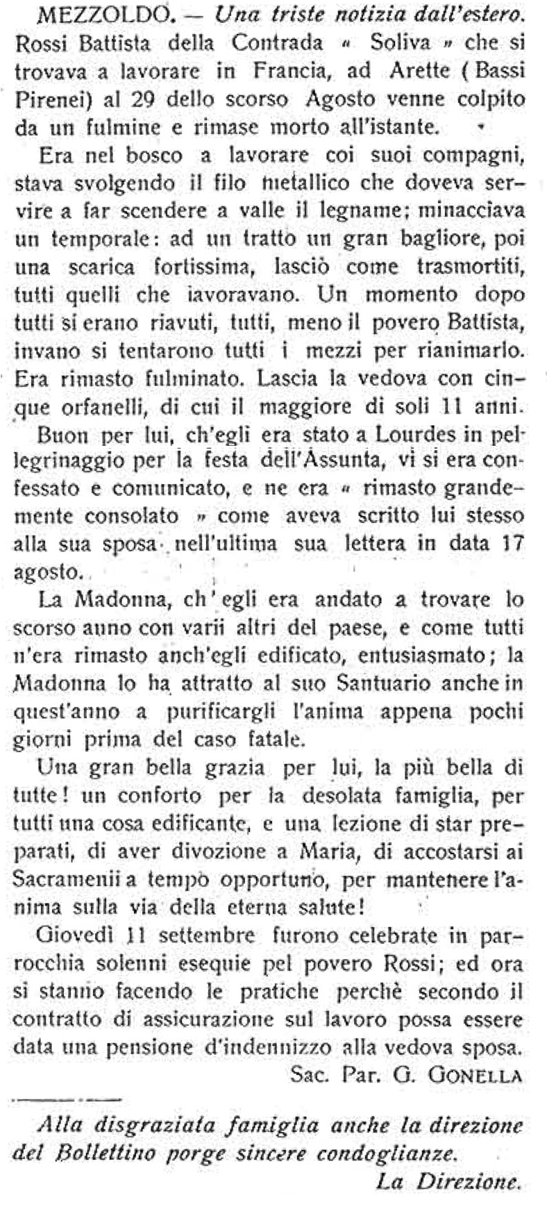 Cronaca de "L’Alta Valle Brembana" settembre 1913 Datazione: 28 agosto 1913 Luogo: Arette, Bassi Pirenei (Francia)Descrizione: L’Alta Valle Brembana, n. 17, settembre 1913 Articolo precedente: Pellegrini Giacomina Prec Articolo successivo: Pesenti Giuseppina Avanti