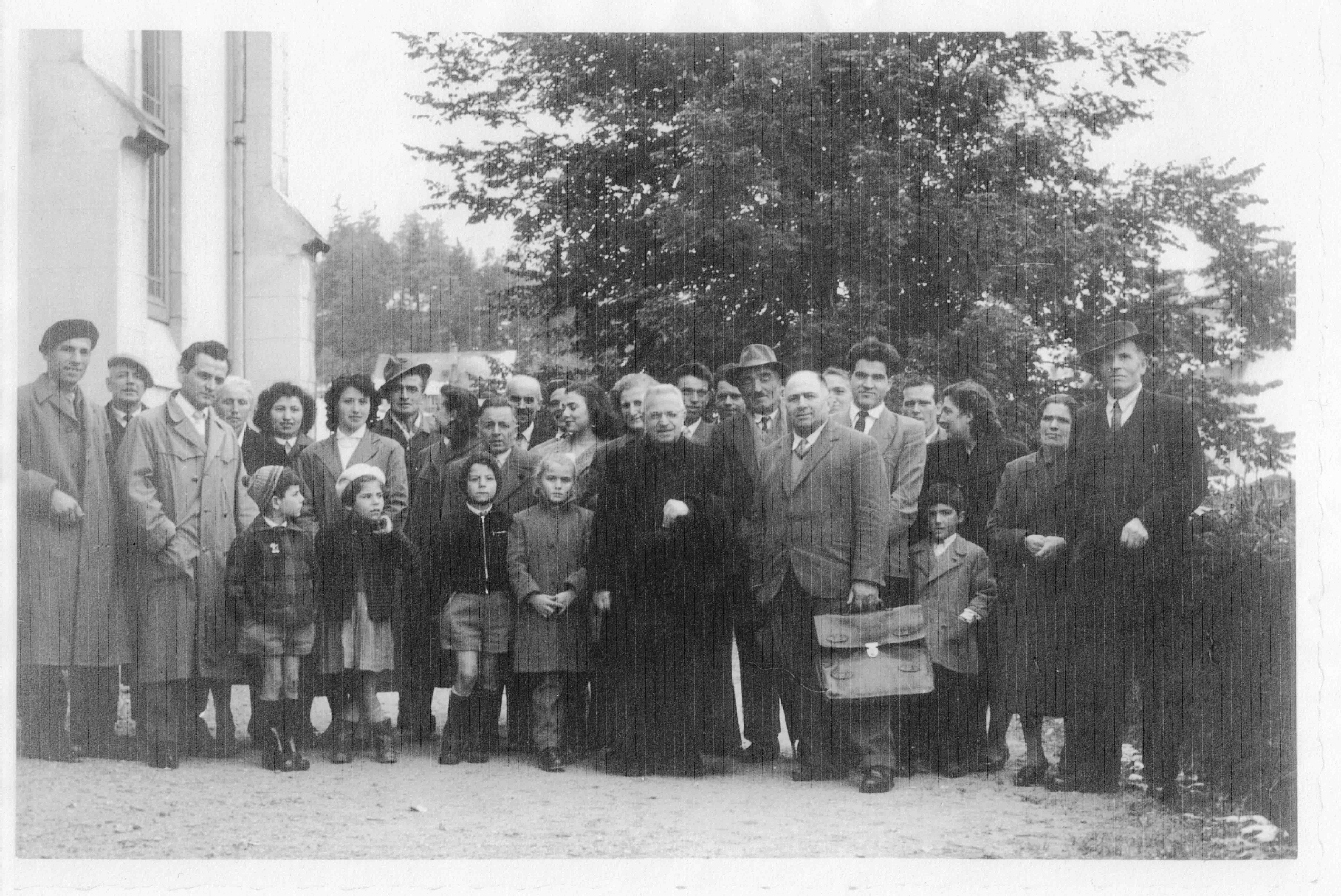 Descrizione: Don Leone Locatelli al centro visita gli emigranti di Brembilla. Da sinistra nucleo Locatelli, Rebucini, “Antoàn”, Busi, Carminati “Pistola” Pesenti “Stèca”, Rinaldi, Gervasoni, Locatelli “Rocol” e Salvi “Piero Nero”.