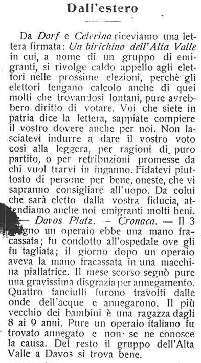 Lettere di emigranti dell’alta Valle Brembana Datazione: giugno 1913Luogo: SvizzeraDescrizione: L’Alta Valle Brembana, n. 12, luglio 1913 Articolo precedente: Locatelli Francesca Prec Articolo successivo: Marconi Caterina Avanti