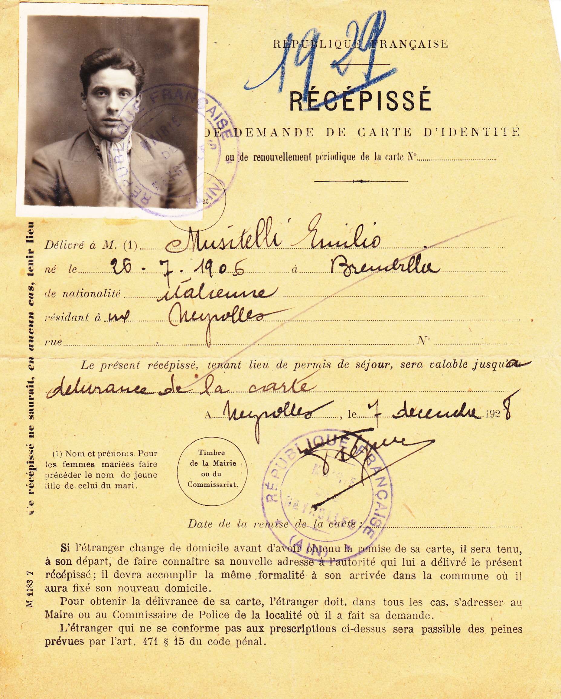 Descrizione: Musitelli Emilio, Caremondi Brembilla, 26.7.1906, boscaiolo a Les Neyrolles.