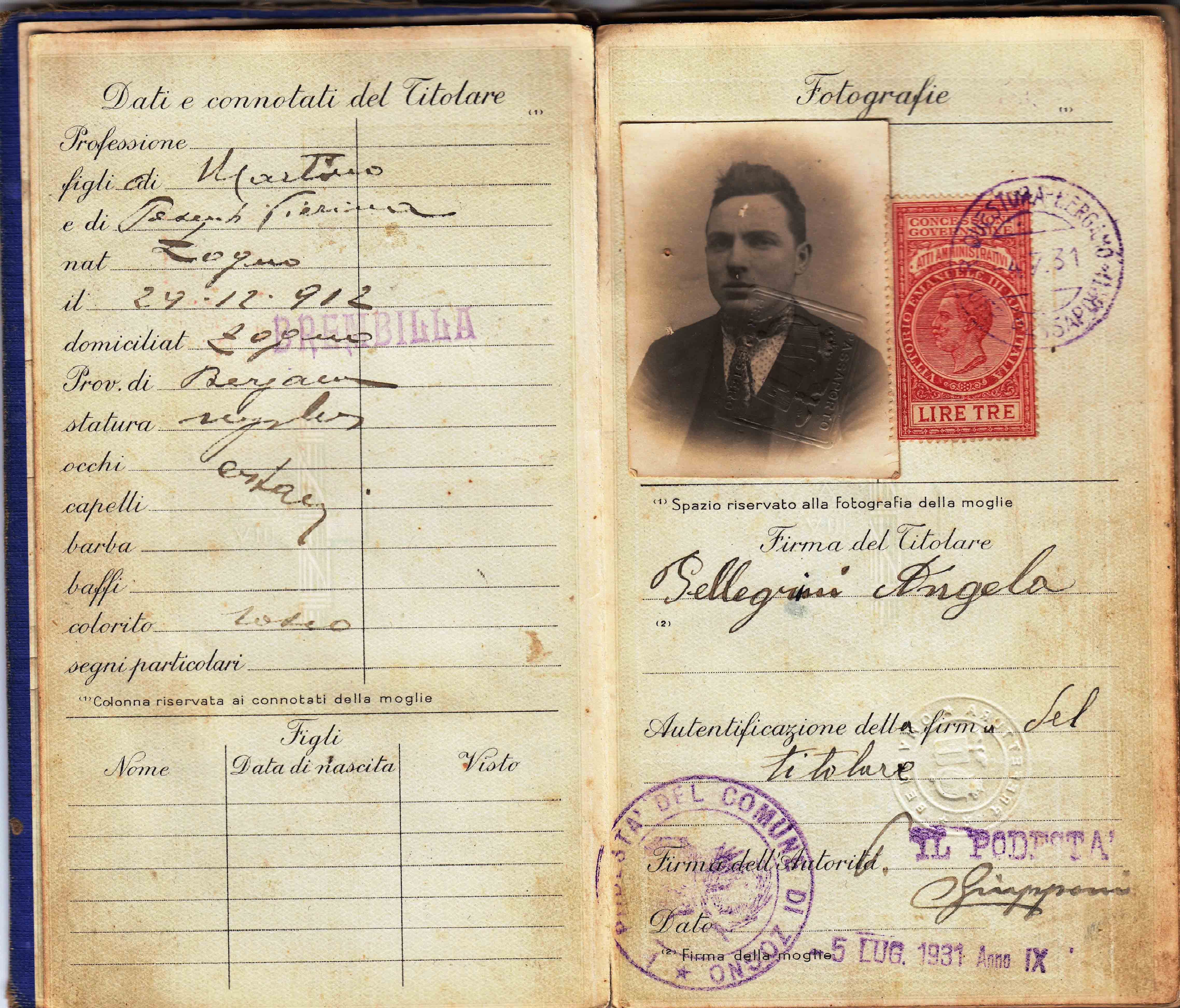 Descrizione: Pellegrini Angelo, Calegreno, Brembilla, nato il 29.12.1912, boscaiolo.