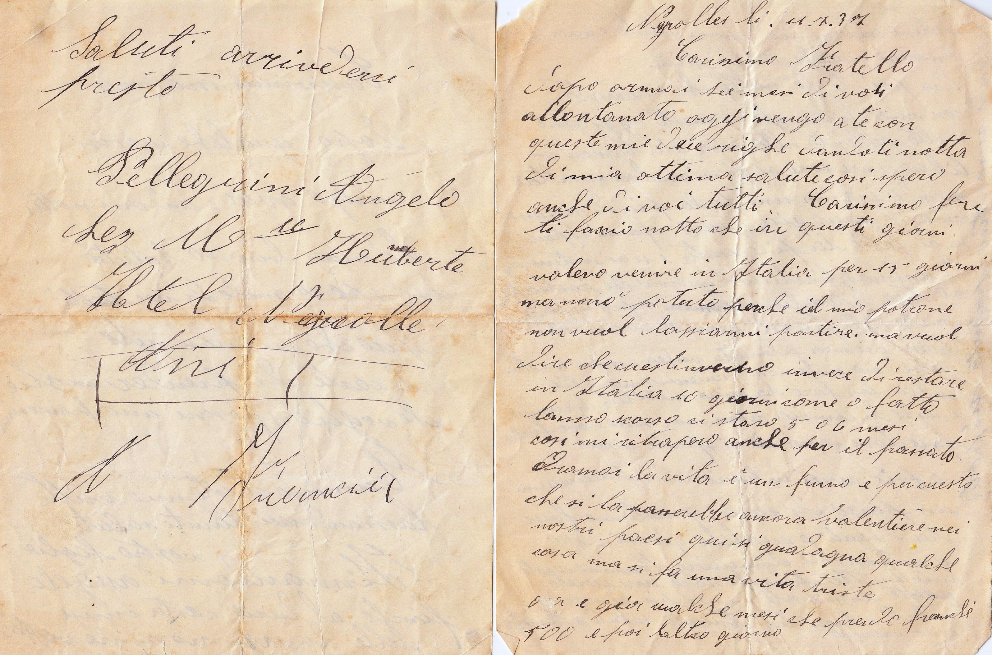 Descrizione: Pellegrini Angelo, Calegreno, Brembilla, nato il 29.12.1912, boscaiolo. Lettera al fratello da Nantua.