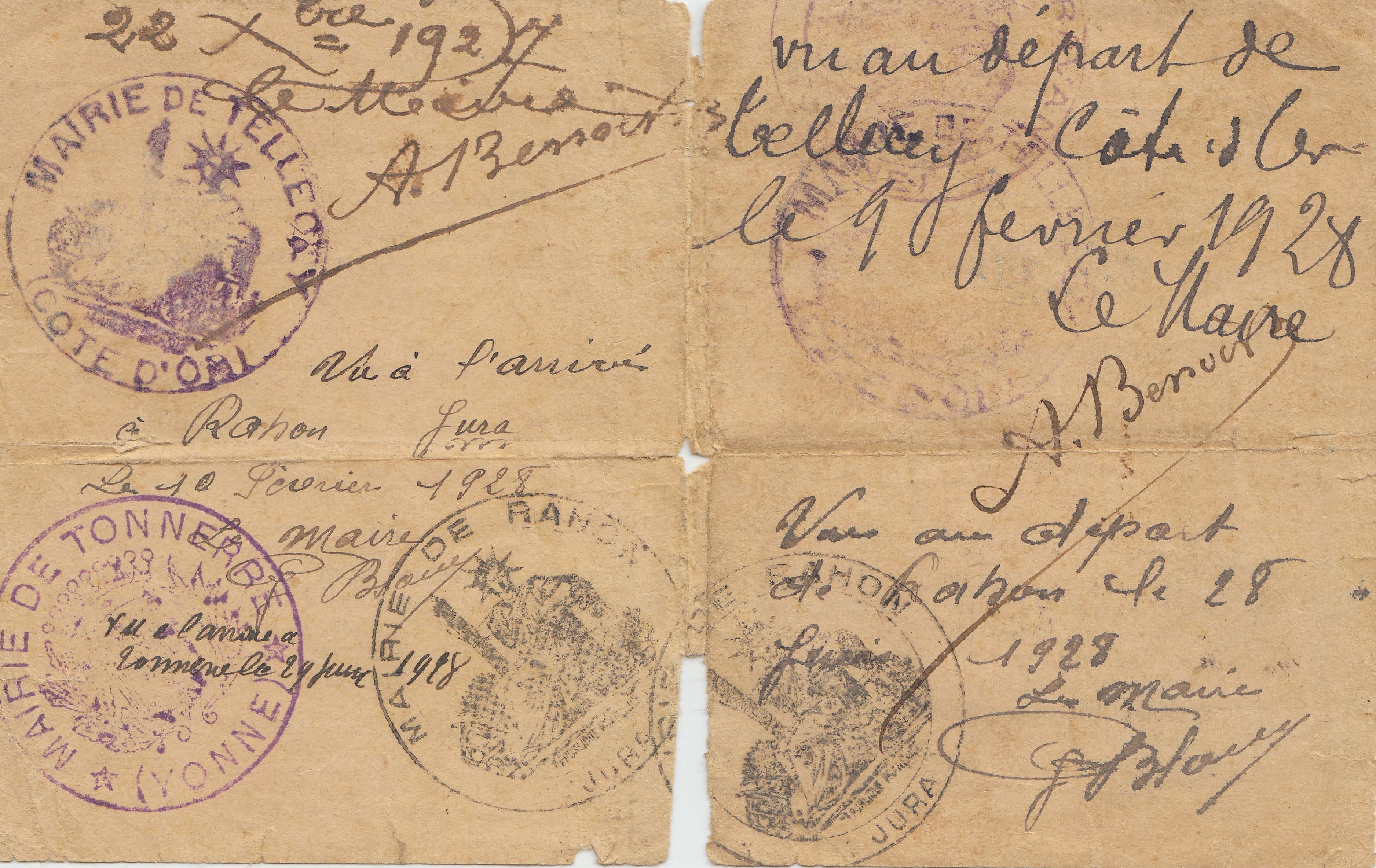 Permesso di soggiorno e lavoro dei sindaci dei paesi della Francia Datazione: 1927Luogo: Tonnerre (Francia)Descrizione: Permesso di soggiorno e lavoro dei sindaci dei paesi della Francia. Articolo precedente: Seghezzi Piero Prec Articolo successivo: Scaini Franco Avanti