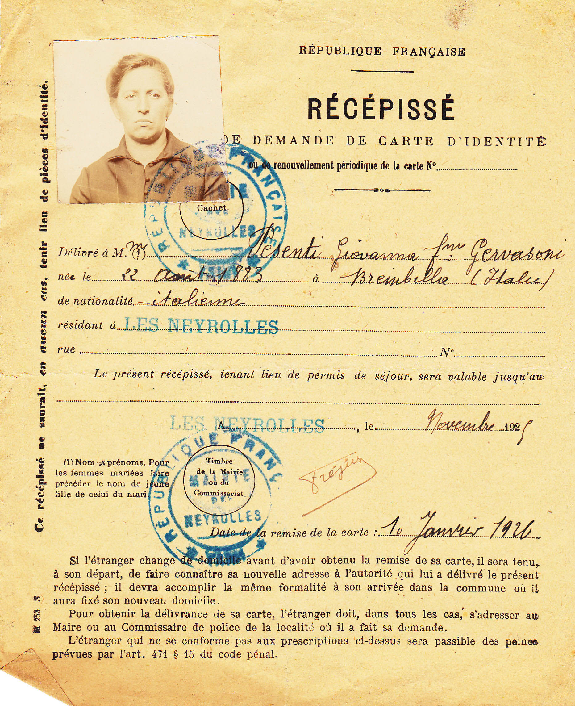 Descrizione: Gervasoni Giovanna, Cabonocchio - Brembilla, 22.08.1883, moglie di di Gervasoni Giacomo.