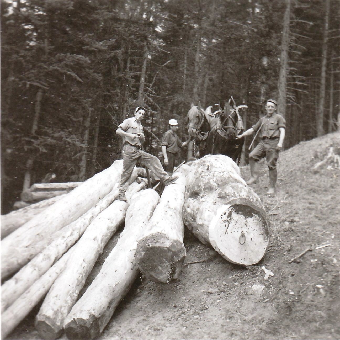 Descrizione: Boscaioli di Malentrata Brembilla: da sinistra il primo è Gervasonii Carlo, il secondo è Sonzogni Battista ”Santantunì”. Tronchi alla teleferica.