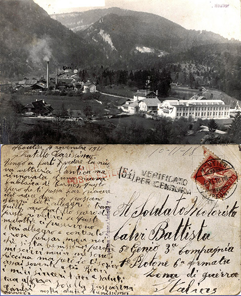 Cartolina con la fotografia della vetreria di Moutier dove lavorava Gasparina Calvi che il 4 novembre 1918, giorno dell’armistizio di Vittorio Veneto, così scrisse al fratello Battista, soldato motorista: “Moutier, 4 novembre 1918. Fratello carissimo. Vengo a farti vedere la mia nuova vettreria, l’antica ma rinnovata et una nuova fabbrica di Tornos, questo spero che ti possa far piacere, cioè vedere dove si passano giorni lieti allegri e tranquilli, caro fratello spero di presto rivederci se queste malattie ci preservano (allude forse all’epidemia di “spagnola”), stai alleggro e contento e non pensar mal a noi che si sta benissimo perché mio scrivi mai a me sono piccina ma però ti scrivo assai sovente a tè. Ricevi i miei sinceri baci e saluti tua aff.ma sorella Gasparina Calvi, nostra salute è benissimo arevoir”.