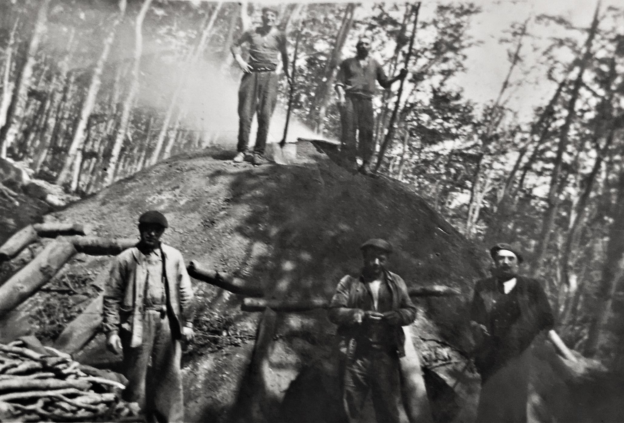 Descrizione: Il millennio serinese comprende le pagine del fenomeno migratorio entro un capitolo fondamentale. Una litania sacrificale vecchia di secoli, la cui intonazione giunge fino a noi con la voce affiochita delle storie che si sentono archiviate con fretta spensierata. A partire dall’emigrazione verso il “teatro del mondo” che era in Venezia, fino alle rotte oceaniche che sbarcavano umanità nei porti delle due Americhe, passando per le fatiche boschive e minerarie del continente europeo, l’emigrazione serinese compone una vera e propria saga leggendaria. In fin dei conti si fa rappresentare come l’industria più longeva e produttiva del nostro paese che, per essere montano, ha fatto i conti con situazioni di estesa povertà. Con la fotografia che vediamo qui – di nitido valore testimoniale - ci troviamo nei boschi di Francia negli anni che precedono di poco la Seconda guerra mondiale. Quante volte nei discorsi dei nostri vecchi abbiamo sentito raccontare le vicende degli emigranti portatisi oltre confine a far carbone! I soggetti che sono rappresentati in questo scatto, messi in posa davanti a una poderosa carbonaia, sono serinesi della contrada “Bosco”. La carbonaia era comunemente nominata con la voce dialettale “poiàt” che si identifica nel cono di legna ammontata, coperta di terra, in procinto di essere convertita in carbone. Guardiamo e riguardiamo questa immagine con sentimenti di profondo e intimo stringimento.