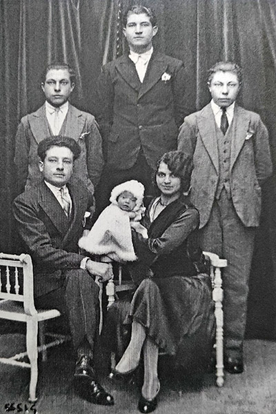 In piedi, al centro, Guido con a lato i gemelli Giuseppe e Angelo; seduto, Alessandro con la moglie Carmela e la piccola Ginette.