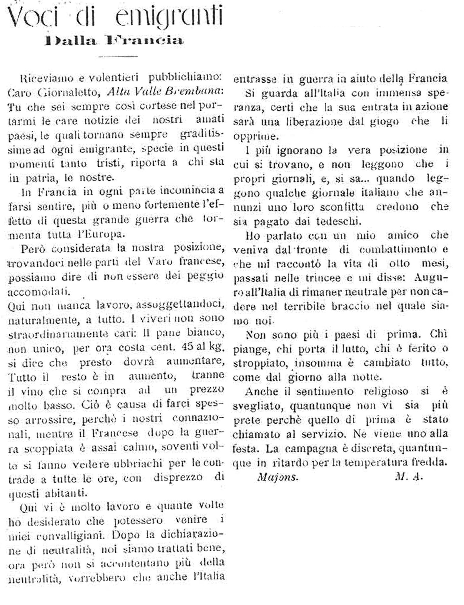Lettera dalla Francia Datazione: maggio 1915Luogo: Mions, Auvergne Rhone Alpes (Francia)Descrizione: L’Alta Valle Brembana, n. 14, agosto 1915 Articolo precedente: Emigranti dell’alta Valle Brembana fotografati in un giorno di festa Prec Articolo successivo: Valceschini Giovanni Avanti