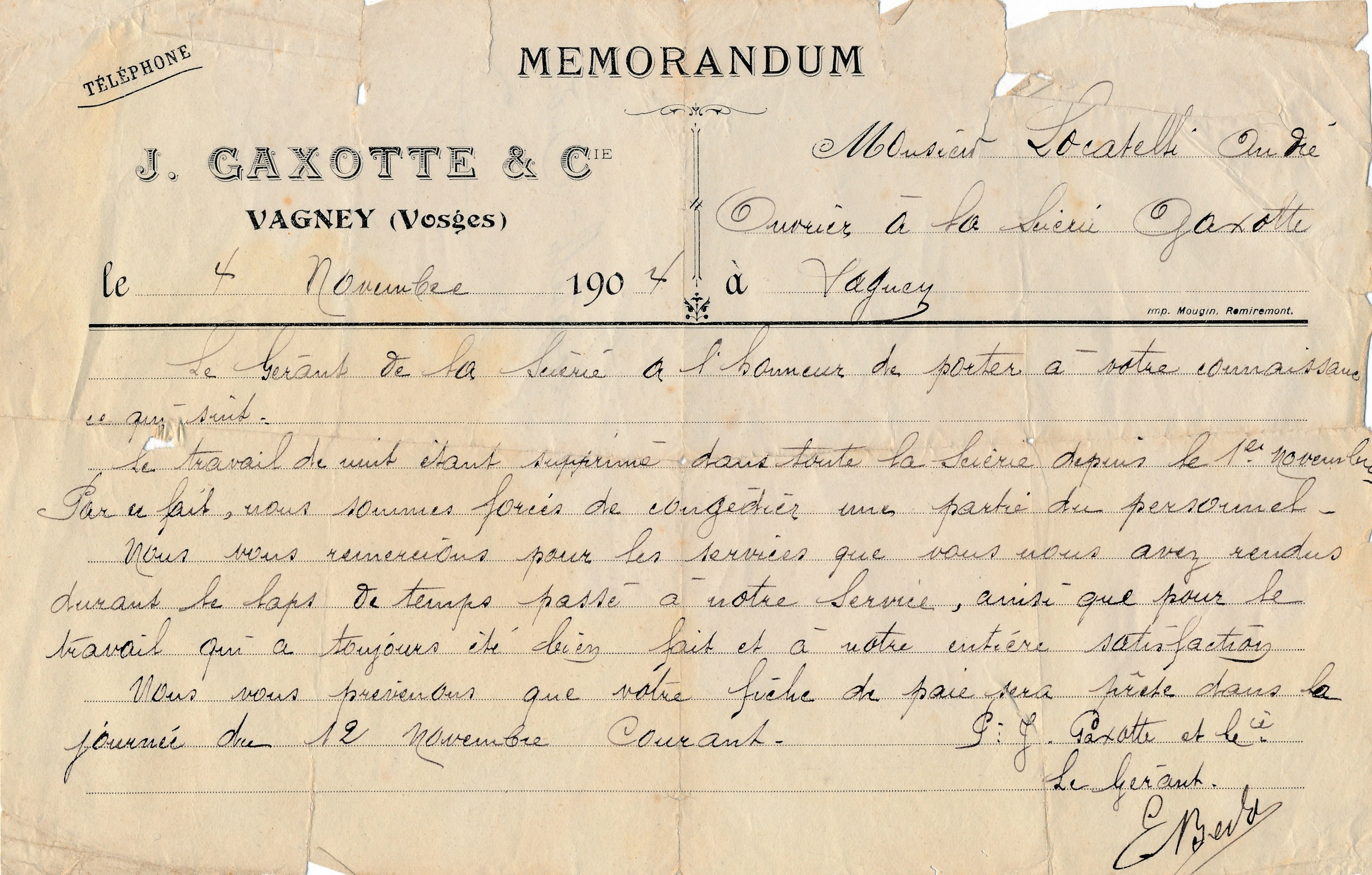 Locatelli Andrea 3 Datazione: 1904Luogo: Vagney (Francia)Descrizione: Encomio della segheria J. Gaxotte & C. di Vagney Vosgi (Francia) conferito ad Andrea Locatelli. Articolo precedente: Pellegrini Lorenzo Prec Articolo successivo: Pellegrini Maddalena Avanti