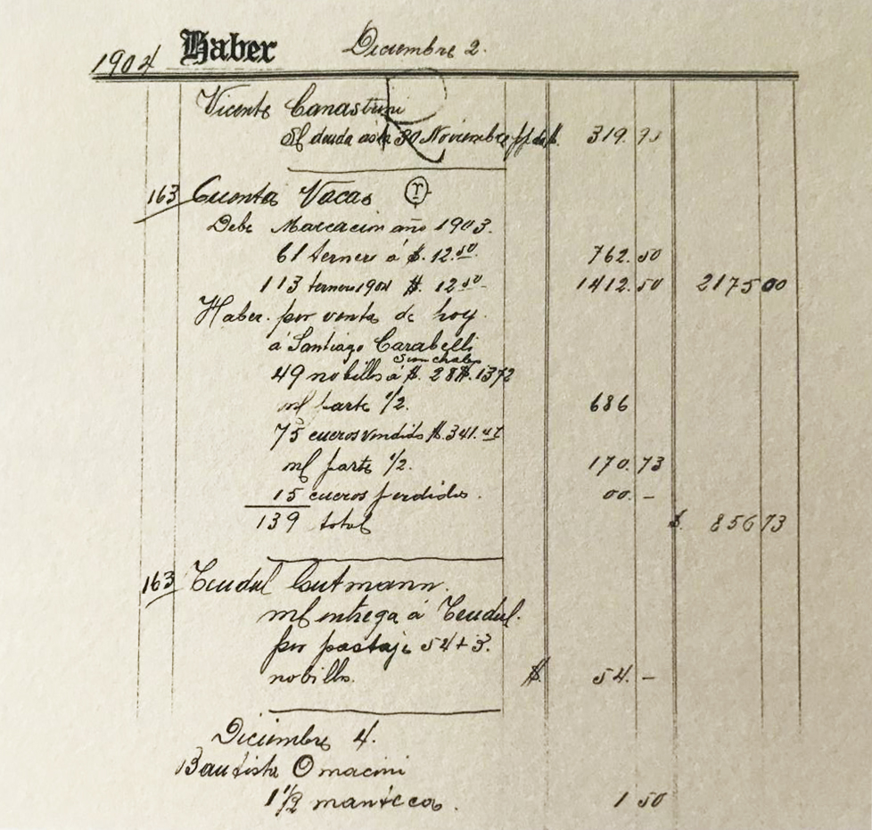 Descrizione: Dal Libro mastro della Sociedad des Vacas di Bepo Omacini. Nel 1905 Giuseppe (Bepo) rientra a Dossena raggiungendo la moglie, suocera Caterina ed i figli Quansito ed Evaristo, nato pure lui a S. Cristobal nel 1900, precedentemente rientrati. Questo perché Bepo ritenne di aver guadagnato a sufficienza e anche per ritirare tutta la proprietà paterna a Dossena dopo aver ben affittato il Deposito e la Sociedad des Vacas per la quale ebbe utili riscossi in banca a Serina per parecchi anni. Infatti la Sociedad prosegui l’attività e rese soprattutto per la forte richiesta durante la guerra 1915-18.