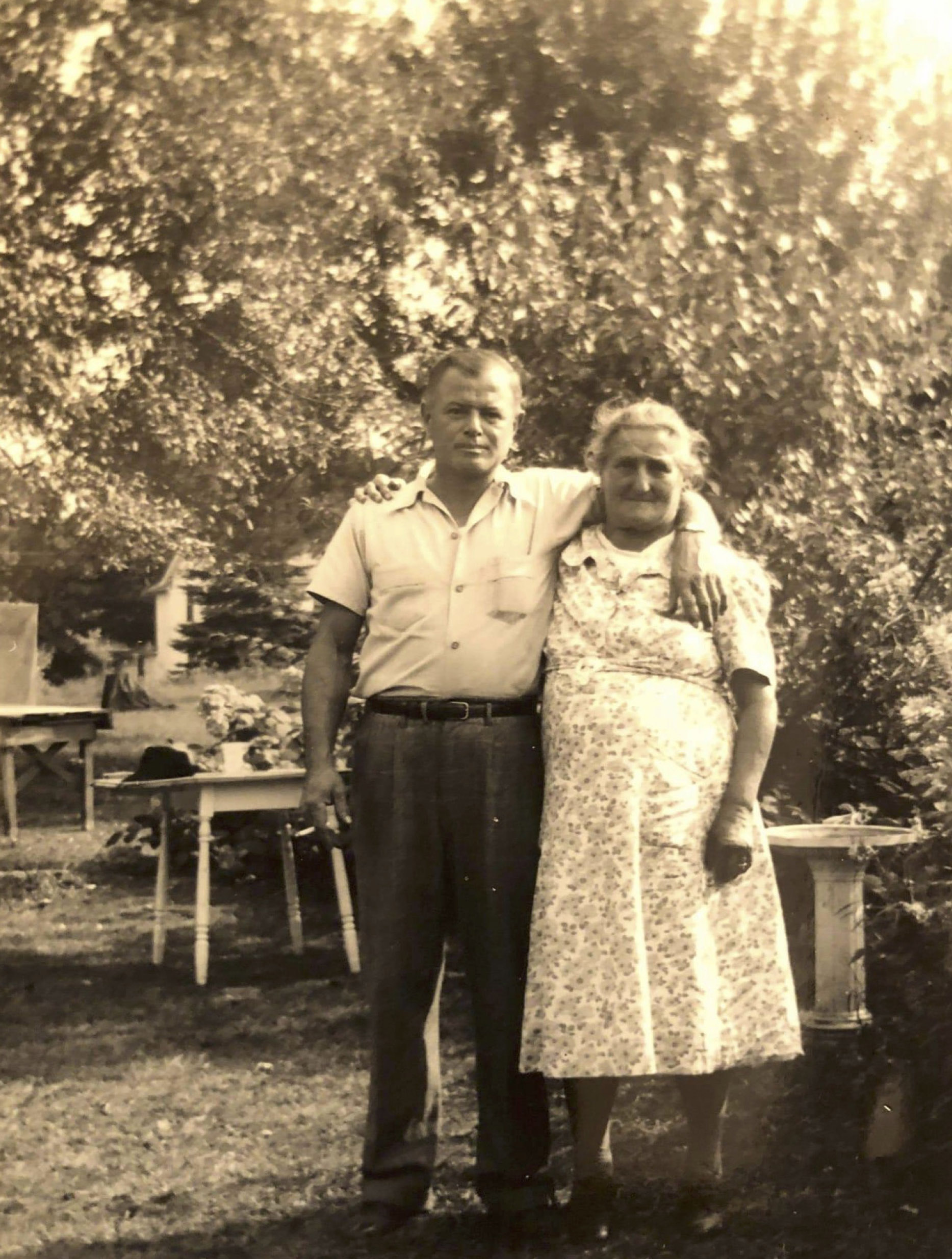 Datazione: 1950 Luogo: Danbury, Connecticut (USA) Descrizione: Giovanni Santo Mosca con la mamma Margherita Cavagna di Santa Croce. Giovanni Santo Mosca (1901), figlio di Giovanni Giacomo, sposa Evelina Tomasini sorella di Stamuda, moglie del fratello Giuseppe Pio.