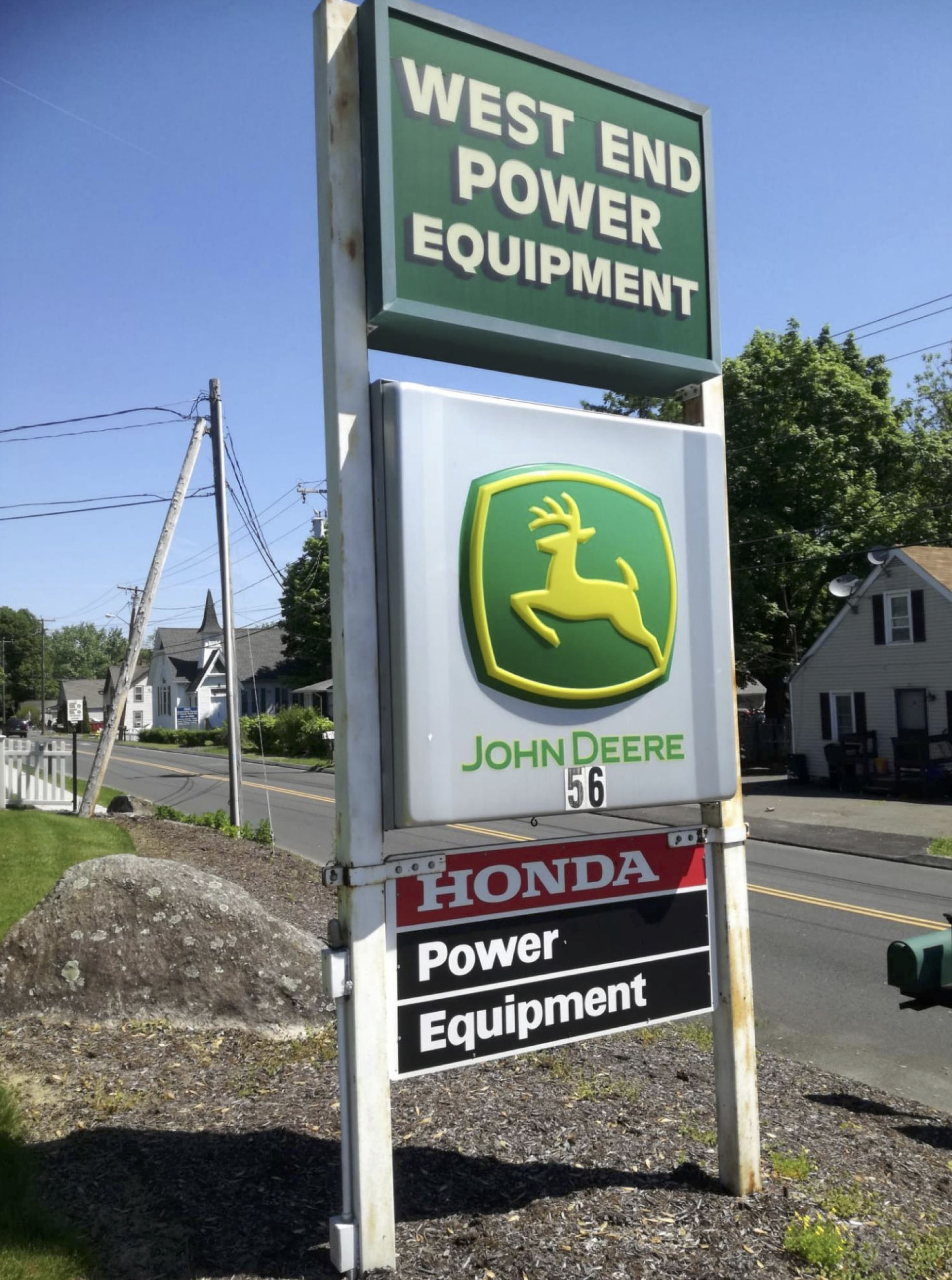 Descrizione: L’insegna della ditta West End Power Équipement di Giuseppe Pio Mosca. La ditta è dedita alla riparazione e alla vendita di trattori, taglia erba, motoseghe e altri articoli.