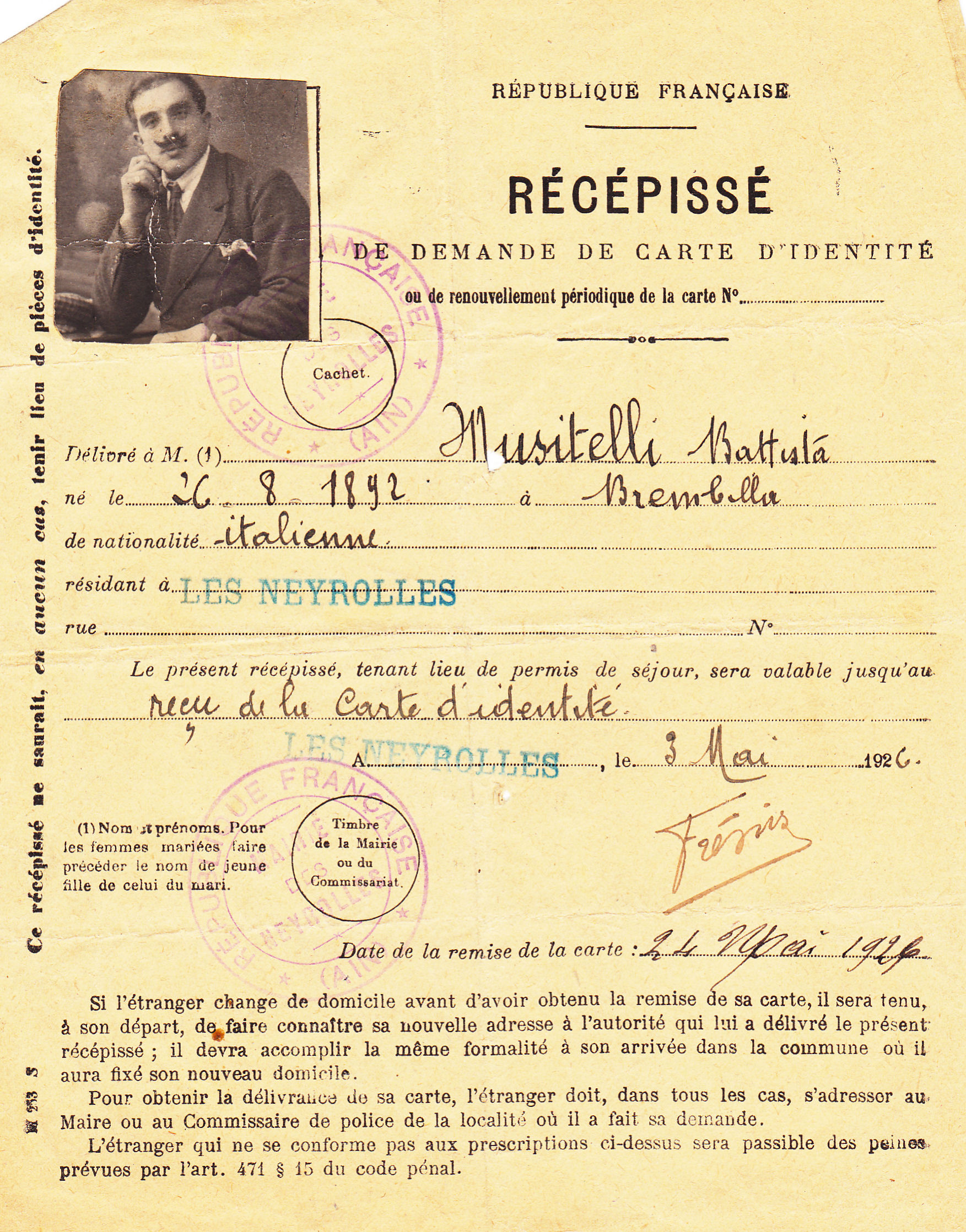 Descrizione: Musitelli Battista, Caremondi Brembilla, 26.8.1892, boscaiolo a Les Neyrolles.
