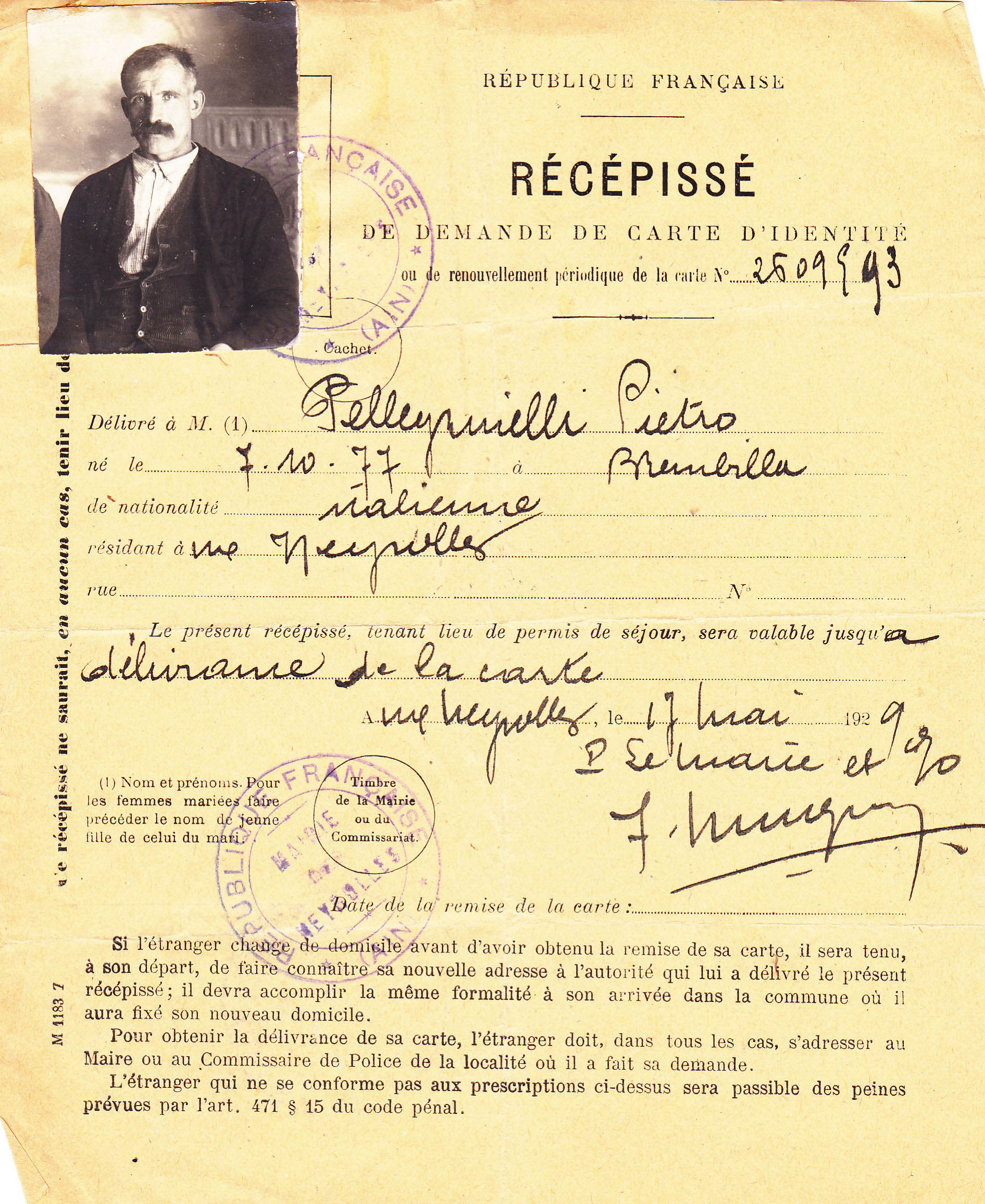 Descrizione: Pellegrinelli Pietro, Calegreno, Brembilla, nato il 07.10.1877.