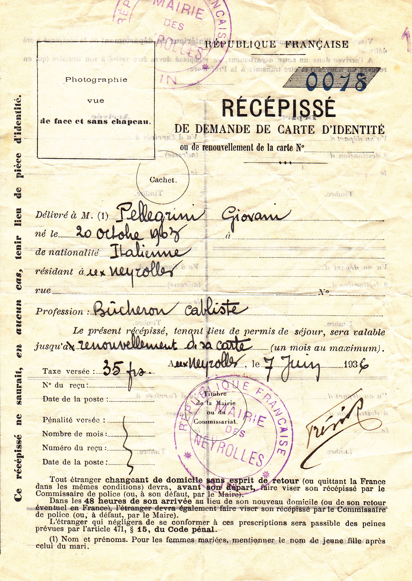 Descrizione: Pellegrini Giovanni, Calegreno, Brembilla, nato il 20.10.1903, boscaiolo cablatore.