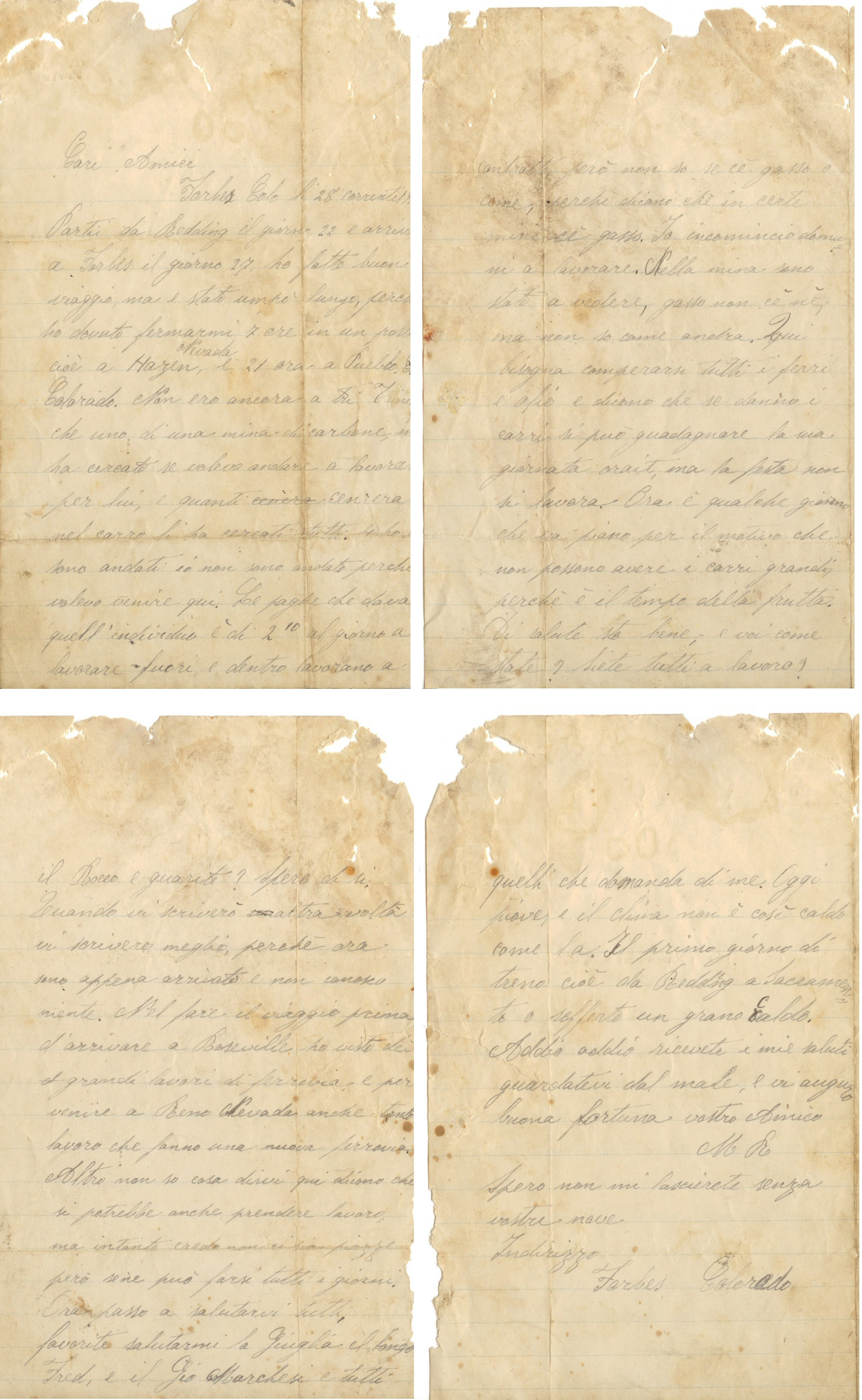 Partii da Redding il giorno 22 e arrivai a Forbes il giorno 27, ho fatto buon viaggio, ma è stato un po’ lungo perché ho dovuto fermarmi 7 ore a un porto cioè a Hazen Nevada e 21 ora a Pueblo Colorado. Non ero ancora a Trinidat che uno di una mina di carbone mi ha cercato se volevo andare a lavorare per lui e quanti cen’era nel carro li ha cercati tutti. 4 ho 5 sono andati io non sono andato perché volevo venire qui. Le paghe che dava quell’individuo è di 2.10 al giorno a lavorare fuori e dentro lavorano a contratto, però non so se cè gasso o come, perché dicono che in certe mine cè gasso. Io incomincio domani a lavorare. Nella mina sono stato a vedere gasso non cè né, ma non so come andra.